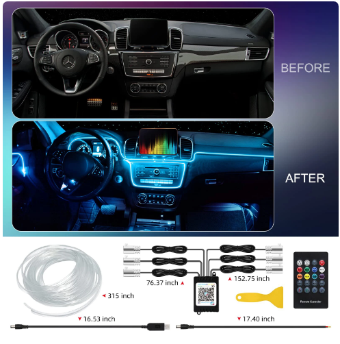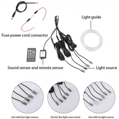Setul de lumini ambientale auto vine cu 5 capete controlabile, fiecare echipat cu fibră optică. Aceasta permite o dispersie uniformă a luminii și un efect spectaculos în interiorul mașinii.Capetele sunt flexibile și pot fi plasate în diferite locații, cum ar fi sub scaune, în jurul bordului sau în portiere, pentru a crea un efect de iluminare unic și personalizat.