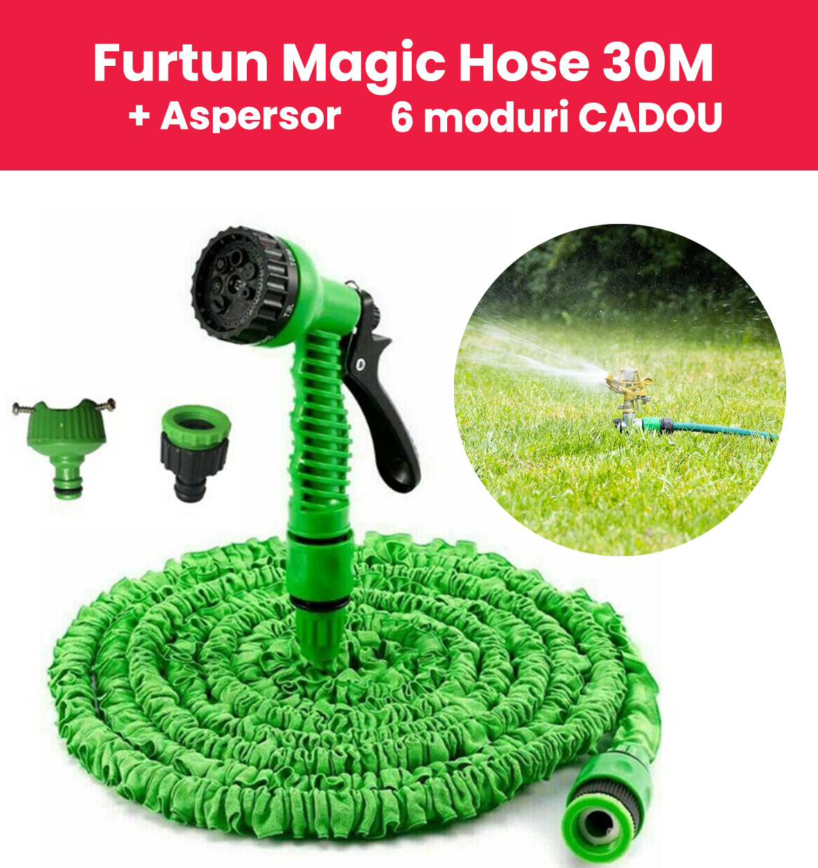 Porniti apa si furtunul Magic Hose se intinde automat de 3 ori.Opresti apa si furtunul Magic Hose revine automat la lungimea initiala!