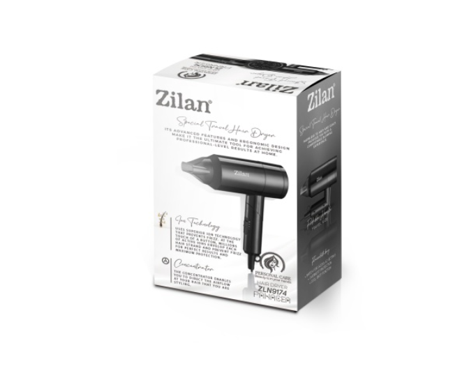 Uscatorul de par Zilan ZLN9174 beneficiaza de o putere de 1800W, 2 trepte de viteza si 3 trepte de temperatura, o bucla de agatare pentru a fi cat mai usor de depozitat. Uscatorul are functie de suflare aer rece dar poate fi folosit si cu aer cald. Uscatorul vine alaturi de manualul de utilizare, certificatul de garantie, un difuzor si un concentrator detasabil.