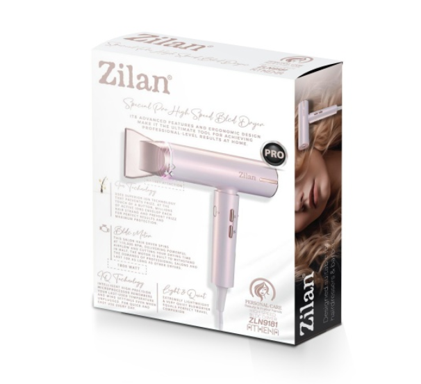 Uscatorul de par Zilan ZLN9181 beneficiaza de un motor BDLC care furnizeaza o putere de 1800W, 3 trepte de viteza si 3 trepte de temperatura. Uscatorul de par este dotat cu duza de aspiratie magnetica si o functie de curatare a prafului atunci i-l aspira. Aparatul poate atinge pana la viteza de 110.000RPM ( rotatii pe minut ), atingand aceasta performanta uscatorul de par impresioneaza prin volumul de zgomot produs, acesta fiind foarte silentios.